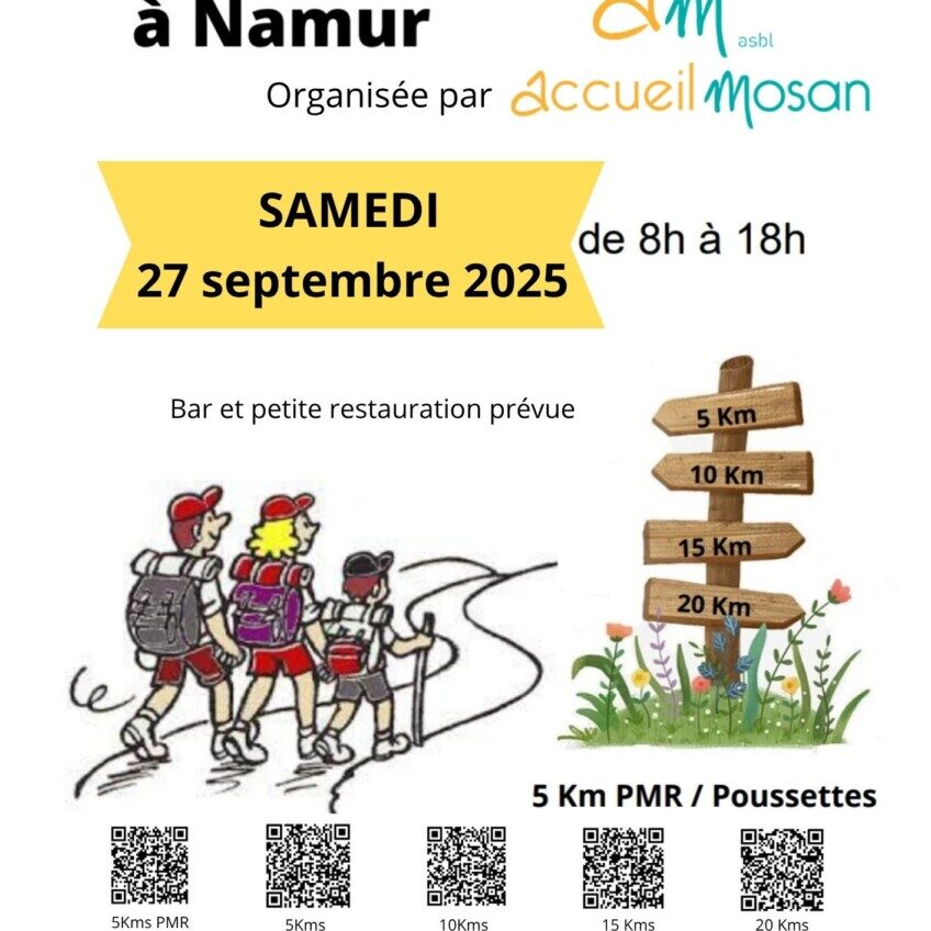 Marche Adeps à Namur organisée par et pour l’Accueil Mosan asbl -> Départ à l’école Hôtelière, Avenue de l’Ermitage, près du château de Namur. -> 5 beaux parcours dans un cadre verdoyant seront fléchés: 5km – 10km – 15km – 20km et un deuxième parcours de 5km Pmr/poussettes, pour découvrir ou redécouvrir la Citadelle de…