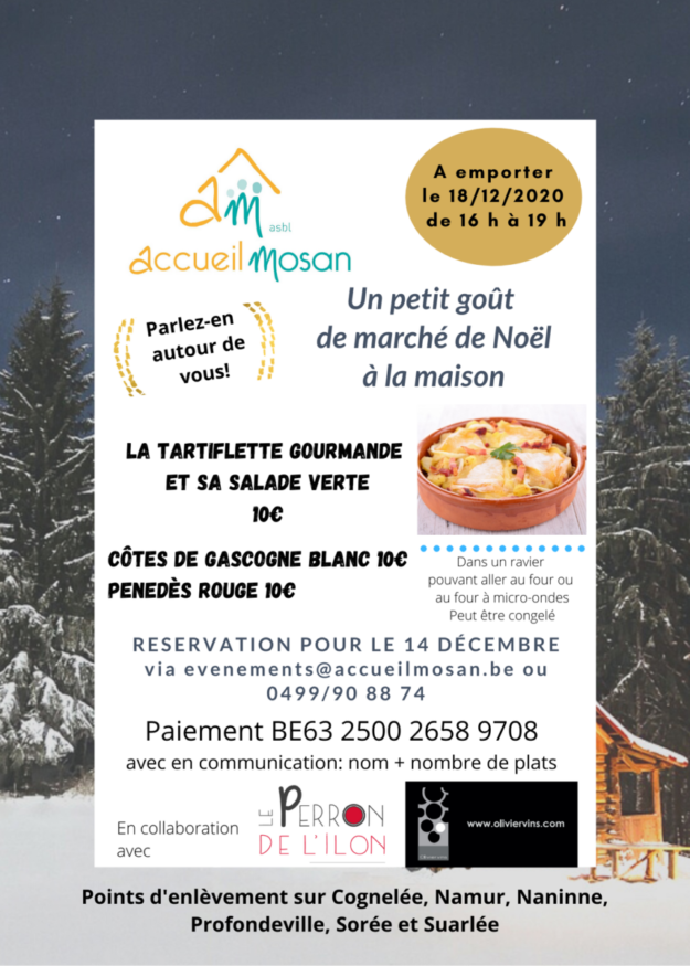 Quoi de mieux qu’une généreuse tartiflette pour se mettre dans l’ambiance du marché de Noël? Un plat qui va réchauffer les corps et les cœurs….. N’attendez pas, commandez vos plats avant le 14 décembre et dégustez le 18 décembre. Chacun chez soi, mais ensemble autour de l’Accueil mosan. Appréciez nos différents points d’enlèvement…. Pensez aux…